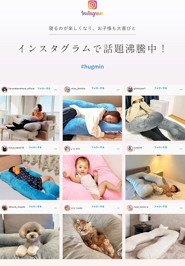 【心地よい眠りをサポートする HUGMIN 抱き枕】 「毎日の睡眠をもっと心地よく」をコンセプトにした寝具限定商品です。 HUGMINの抱き枕は、妊婦さんの負担軽減はもちろん、横向き寝や腰痛に悩む方からも高い支持をいただいているU字型設計。 体圧を分散し、からだ全体を包み込むように支えることで、自然な姿勢をキープ、快適な睡眠へ導きます。