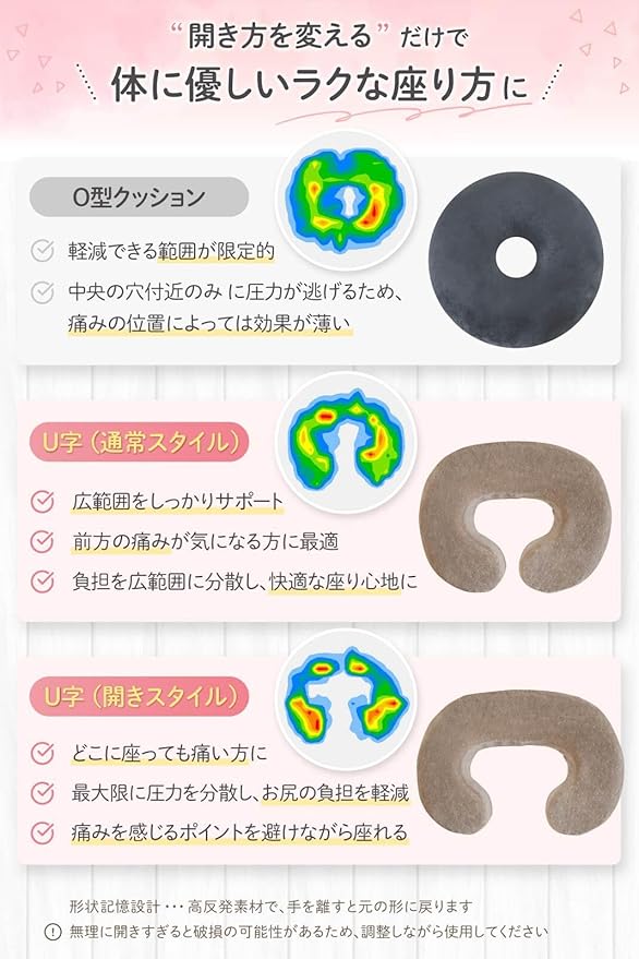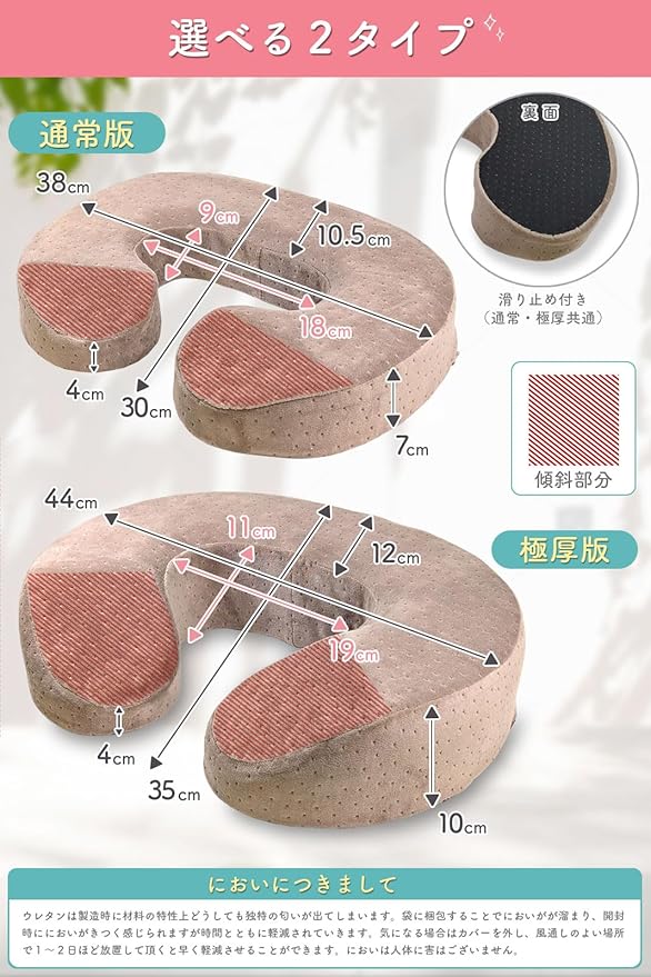 【U字クッションの臭い改善について】クッションの材質(ポリウレタンフォーム)の特性上、どうしても臭いが出てしまいます。害はございませんので風通しのいい所で2-3日ほど干していただきますと無臭になりますのでお試しください。【独自の金型】ありそうでなかったU字タイプの高反発マタニティクッション。その理由はクッションを形成する為に必要な金型がない為です。一から金型を作るとコストがかかる為、一般的には既存の型を使用することが多いのです。O型ではどうしても患部があたりサポートしきれない為、オリジナルで金型を作ることを決意し、商品化いたしました。少しでも辛さが軽減できれば幸いです。