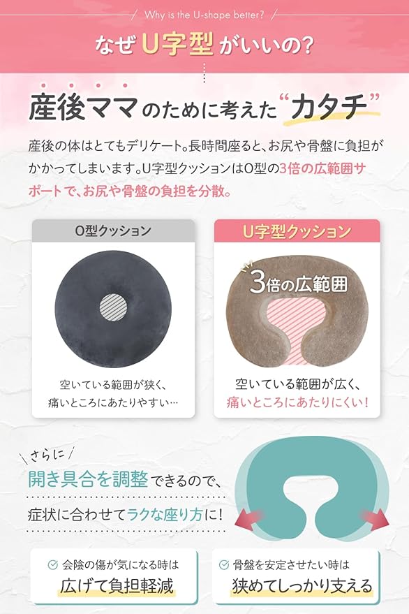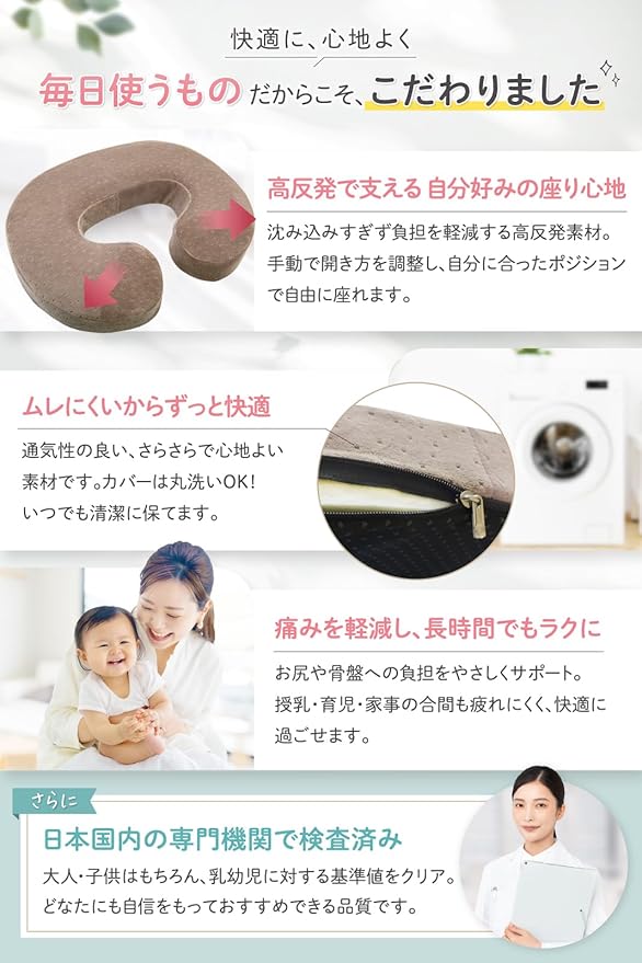 【特に産後のママに大活躍】前かがみになりやすい、傷口の痛みが軽減しました、痛いところをよけて座れます、長時間座ることも可能、自分で調節できるのが一番気に入った などたくさんの声を頂いております。もちろん、産前の妊婦ママにもおすすめをしていますのので、是非お試しください。