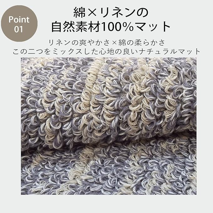 【安心品質の日本製】いつも身体に触れるものだからこそ、安心してお使いいただける国内生産です。【吸湿性・耐久性に優れている】コットンリネンは植物の繊維から生まれており、吸湿性と耐久性に優れた天然素材です。【滑り止め加工済み】マットの裏面には、不織布に合成ゴム(ホットメルト)を溶着しているので、滑りにくく安全です。 別途、滑り止めシートをお求め頂く必要はございません。