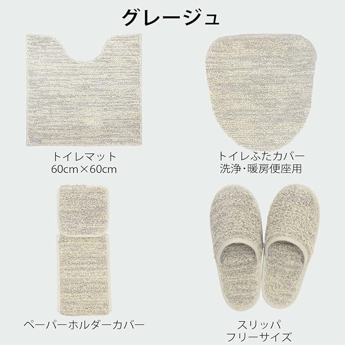 San-Luna トイレタリー 4点セット 「ストローク」グレージュ リネン コットン | トイレマット 60cm 60cm トイレふたカバー スリッパ トイレットペーパーホルダーカバー 日本製 洗える おしゃれ かわいい 綿 麻 足元 足下 マット 60 60 | etshop