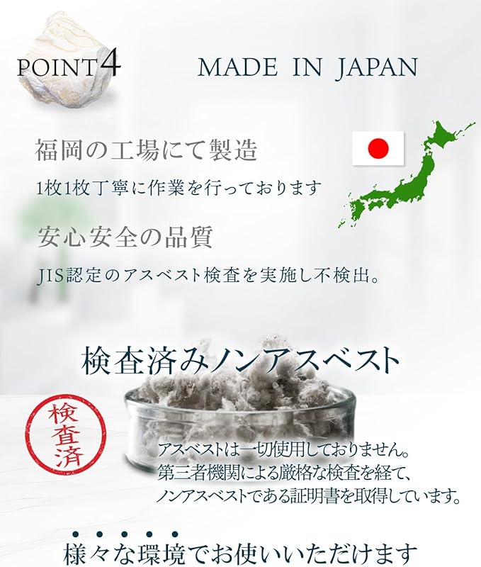 【ノンアスベスト】アスベストは、一切使用しておりません。第三社機関による厳格な検査を経て、ノンアスベストである証明書を取得しています。