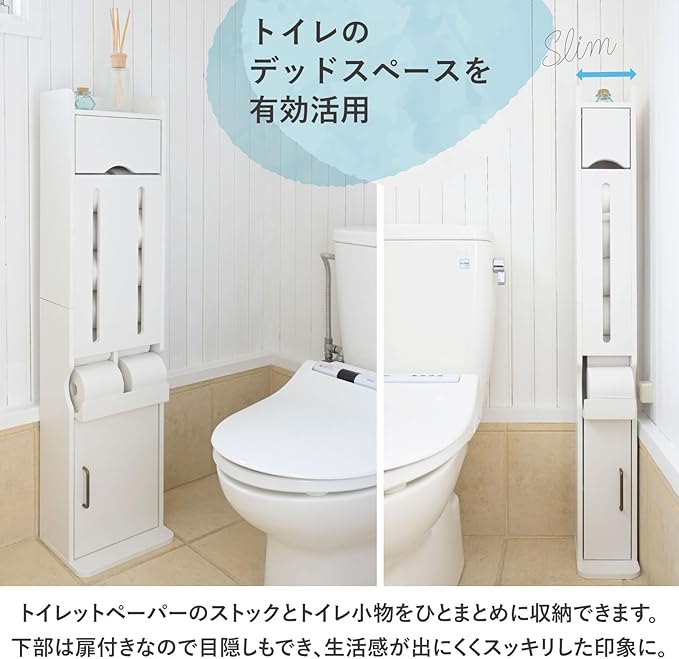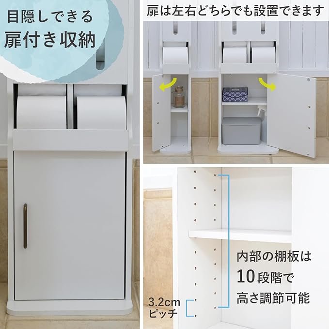 【消耗品のストックにも】扉内には掃除道具や、ストックなどを収納できます。扉は左右どちらにも設置できるので、トイレに合わせて使いやすい方を選択できます。