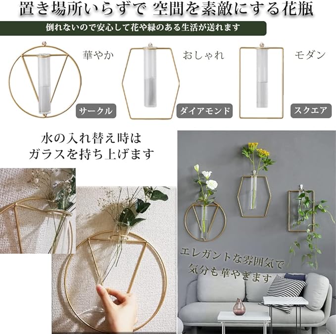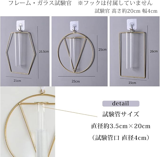 【壁掛け花瓶】ゴールドフレームとガラス試験官(直径約3.5cm 20cm)のセット。高級感と清涼感のあるインテリア雑貨です。