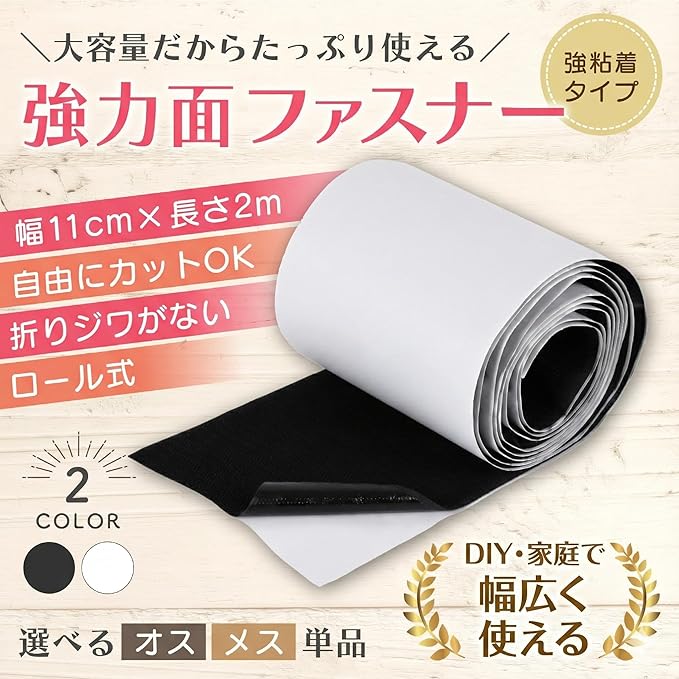 ✅お客様のご要望にお応えして幅11cm、長さ2mのメスのみが新登場!✅【 何度でも着脱可能 】耐久性に優れたマジックテープ素材で、何度でも繰り返して貼りつけたり剥がしたり自在にできます。糊付き粘着タイプのベルクロ面ファスナーなので、縫製タイプでは縫い付けできない金属、プラスチック、ガラス、タイルなどにも簡単接着。