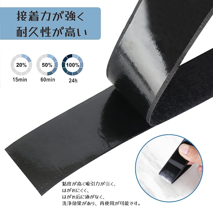【超強力面ファスナー】強力なかみ合わせ力を持って、繰り返し脱着ができます。なお超強力両面テープが付いているので、様々なものを貼り合わせる目的で使用します。
