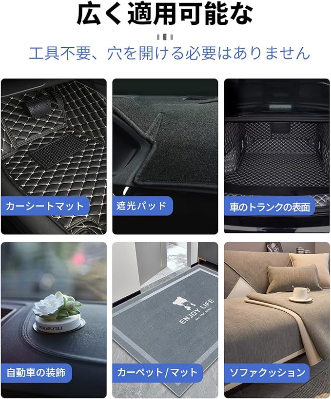 【幅広い用途】屋内・屋外どちらでも使用可能です。ソファクッション、ラグ、カーマット、カーテン、リモコン、写真フレームの吊り下げ、クラフトの取り付け、ガレージツールの整理、電源タップやケーブルの整理、LEDライト、飾り、ホワイトボードなど、さまざまな取り外し可能なアイテムの取り付けに適した一時的な解決策です。産業用にも日常生活用にも適しています。あなたの生活をもっと簡単にします。