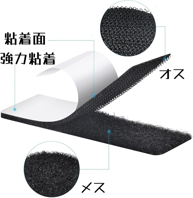 【超強力面ファスナー】強力なかみ合わせ力を持って、繰り返し脱着ができます。なお超強力両面テープが付いているので、様々なものを貼り合わせる目的で使用します。