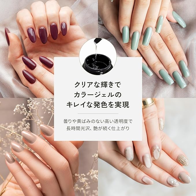 【艶のあるクリアな輝き】曇りや黄ばみのない高い透明度が特徴のベースジェル&トップジェル。長時間光沢と艶が続く仕上がりで、カラージェル本来の綺麗な発色を実現します。