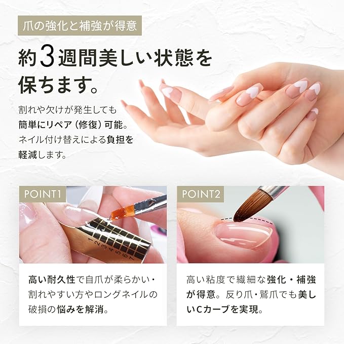 【本格セルフネイルを楽しみたい方に】操作性の高い「硬め」な粘度のベースジェル・トップジェルが嬉しいセットに。垂れにくく流れにくいため、繊細なぷっくりデザインをお楽しみいただけます。倒れにくいコンテナタイプの容器を使用しています。