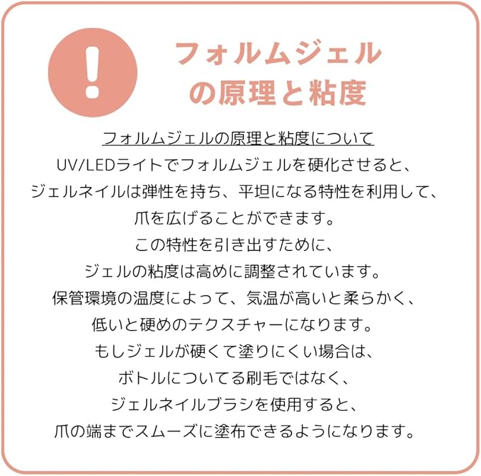 フォルムジェルは転売を禁止しています。 フォルムジェルは爪に塗ってライトで硬化します(ジェルネイルを硬化するLEDライト6W以上が必要です) ※モッタリとした粘度が高めの硬いジェルネイルです