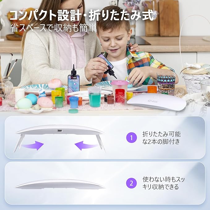 【簡単操作&持ち運び便利】60秒/120秒のワンタッチ照射ボタン付きで操作が簡単。150cmの超ロングUSBケーブルを採用しており、作業中でも自由にライトを移動できます。重さはわずか143g、折りたたみ式のスタンド付きで、どこでも気軽に持ち運び可能です。