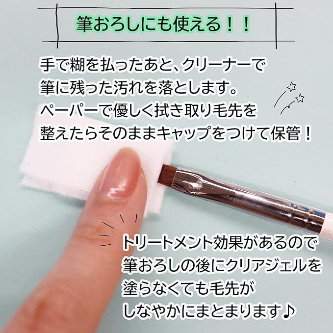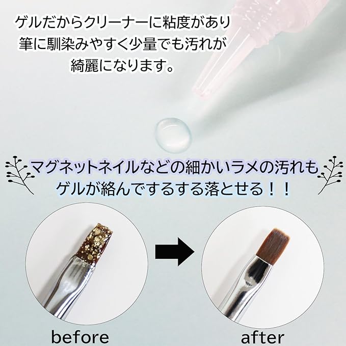 油分の効果で筆の乾燥を防ぎ毛先がしなやかにまとまります。 マグネットネイルのような細かいラメも濃いカラージェルの汚れも綺麗に落とせます♪