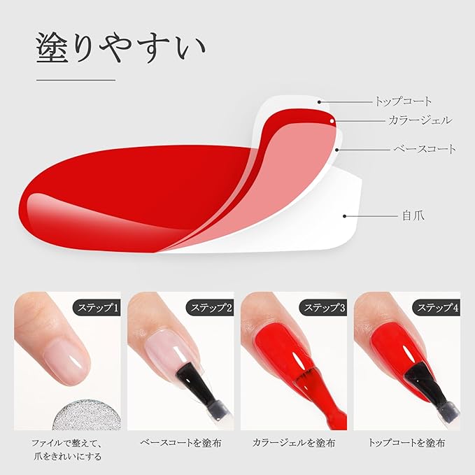 【28日以上長持ち】ネイル表面を保護し、ジェルが剥がれにくくし、適切なステップに従って、輝くツヤが最長4週間以上持続できます。(爪の表面を磨くと、ネイルアートの持続時間が長くなります)自や肌に優しい天然レジンを使用し、無毒で安心してお使いいただけます。
