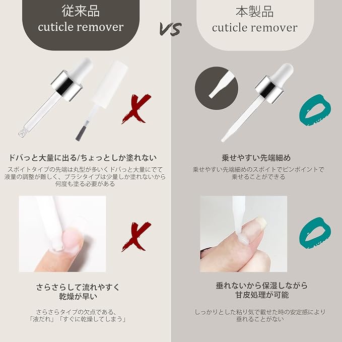 【スポイトタイプの良さ】従来のスポイトは断面が水平で太くなっていたため液量の調整が困難でした。LULUGEL キューティクルリムーバーは先端を細くすることにより適量に使うことが可能になりました。