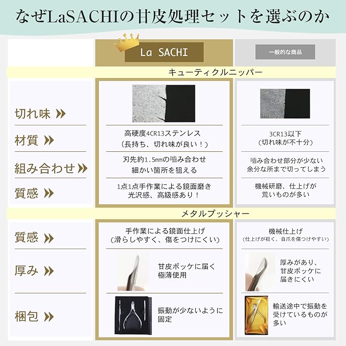 【甘皮ニッパー 】は理美容専門のハサミ職人に監修頂きました。見た目どれも同じように見えるニッパーですが、使ってみればその差は一目瞭然。本当に良いものはストレスフリーな使い心地です。La SACHIの 甘皮ニッパー は滑らかなダブルスプリングのハンドル、左右の手ともに持ち易いよう長めの設計、厳しいテストにパスした切れ味、更に刃先を1.5mmの噛み合わせにすることで、余計な皮膚をひっぱったり、切り落とすことなく、細い甘皮やささくれを狙った箇所だけスパッと切り落とせます。