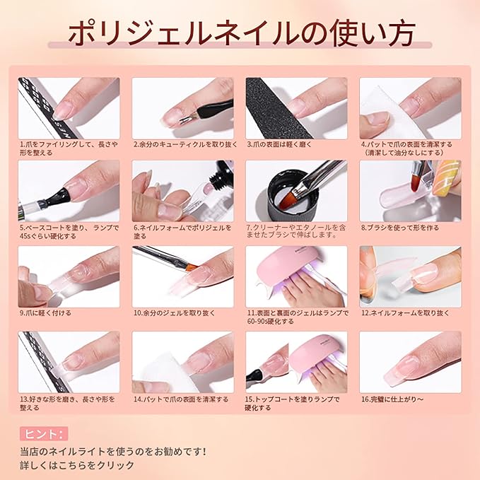 セット内容:このポリジェルセットには、15 g * 2本の長いだしジェル、スリップソリューション、ベースとトップコート、ネイルツールが含まれており、ネイルサロンや自宅のDIYに最適です