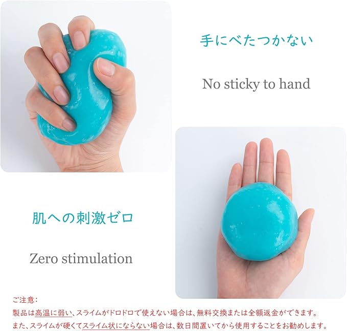 【使用上の注意】①製品は高温に弱い、涼しい場所に置いてください;②粘着性を保つため、水や油から遠ざけてください;③硬くてちぎれやすい場合は、数日間置いてから利用してください