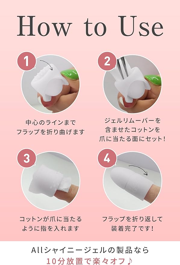 ✨【使用方法】 (1)ソークオフキャップの中心のラインまでフラップを折り返します。 (2)ジェルリムーバーを含ませたコットンを爪にあたる面にセット! (3)コットンに爪があたるように指を入れます。 (4)フラップを折り返して装着完了です!