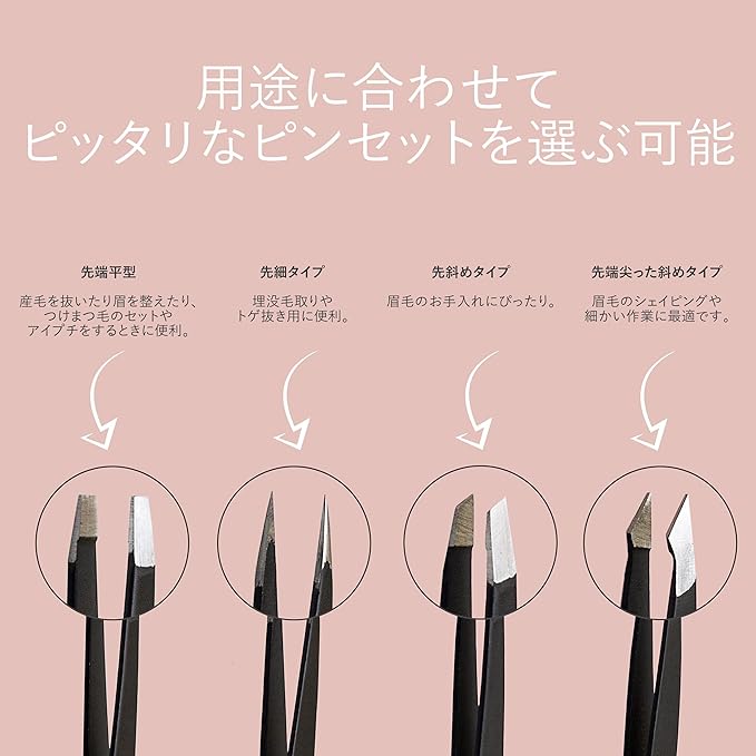 【マルチに対応】先端平型、先細タイプ、先斜めタイプと先端尖った斜めタイプという4種類を揃えております。先端平型は産毛を抜いたり眉を整えたり、つけまつ毛のセットやアイプチをするときに便利で、先細タイプは埋没毛取りやトゲ抜き用に便利です。また、先斜めタイプは眉毛のお手入れにぴったりで、先端尖った斜めタイプは眉毛のシェイピングや細かい作業に最適です。