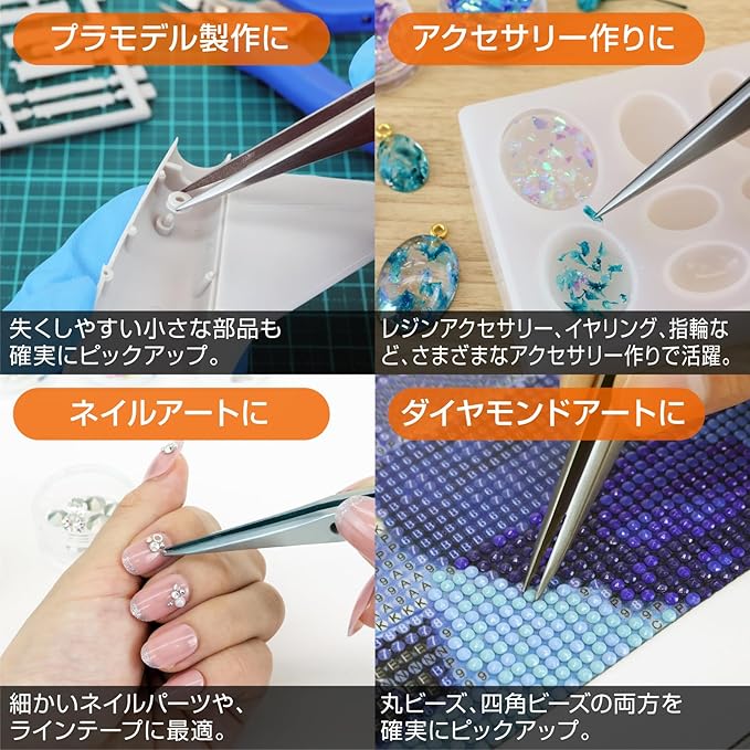 【多用途対応:精密作業から趣味制作まで】電子部品の交換・組立、ハンダ付け、ネジの保持はもちろん、プラモデル製作やアクセサリー、ネイルアート、ビーズワーク、ダイヤモンドアート、手芸、標本製作、ペーパークラフト、ポーセラーツ、園芸など、多彩なシーンで活躍します。強力な保持力と高精度な先端が、どんな素材でもしっかりつかみ、安定した作業を実現。プロフェッショナルからホビーユーザーまで、すべての“つかむ作業”を支える信頼の一本です。