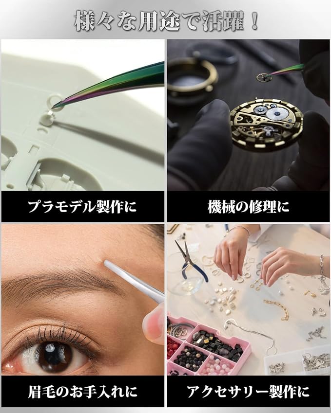 超精密ピンセットと先丸ピンセットの2本セット。繊細な作業から傷をつけたくない作業までこの1セットで全てを網羅します。
