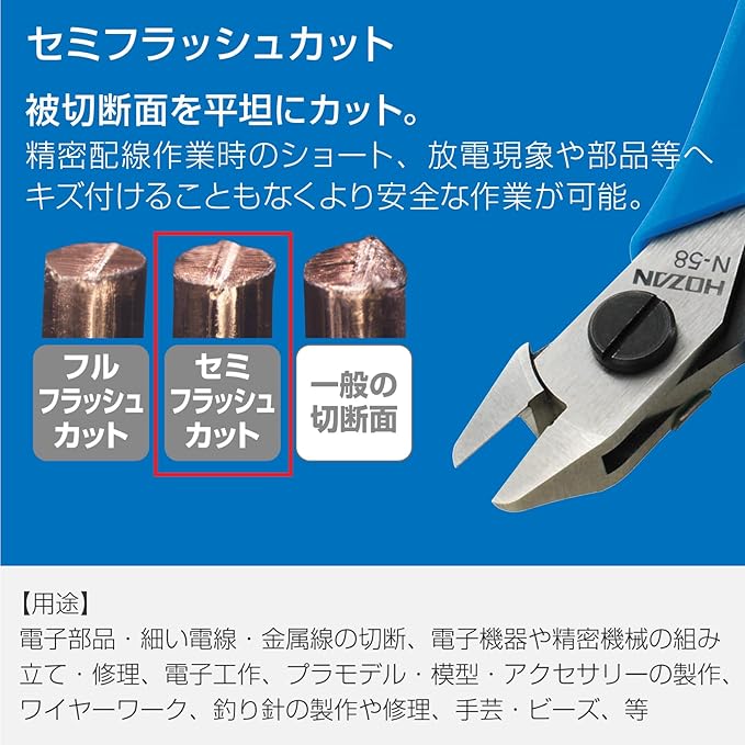 ・【切断能力】銅線:0.18~0.8mmφ(リードストッパー有効範囲)【硬度HRC】本体:46、刃部:60【ESD管理値】Rg<1 10^12Ω【重量】40g【全長】105mm【用途】電子部品・細い電線・金属線の切断、電子機器や精密機械の組み立て・修理、電子工作、プラモデル・模型・アクセサリーの製作、ワイヤーワーク、釣り針の製作や修理、手芸・ビーズワーク