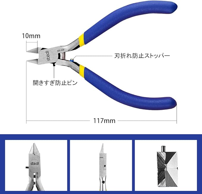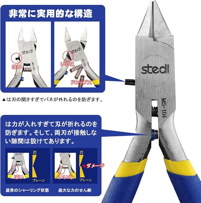 薄刃 片刃 工具:薄刃は部品に近づけて切ることができて、出っ張り少なく、軽い力で切れます。挟み込んで千切るような両刃ニッパーとは違い、片側からの切断で切り終わりが端になるのでカット後が目立ちません