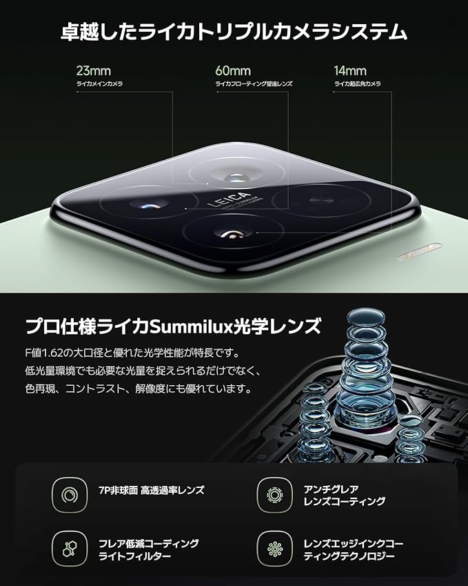✅ライカ共同開発のトリプル5000万画素カメラ:Xiaomi 15は、卓越した画質を実現するライカ共同開発のトリプルカメラシステムを搭載。14mmから120mmまでの焦点距離をカバーするカメラシステムは、あらゆるショットに高精細かつ豊な色表現を提供します。