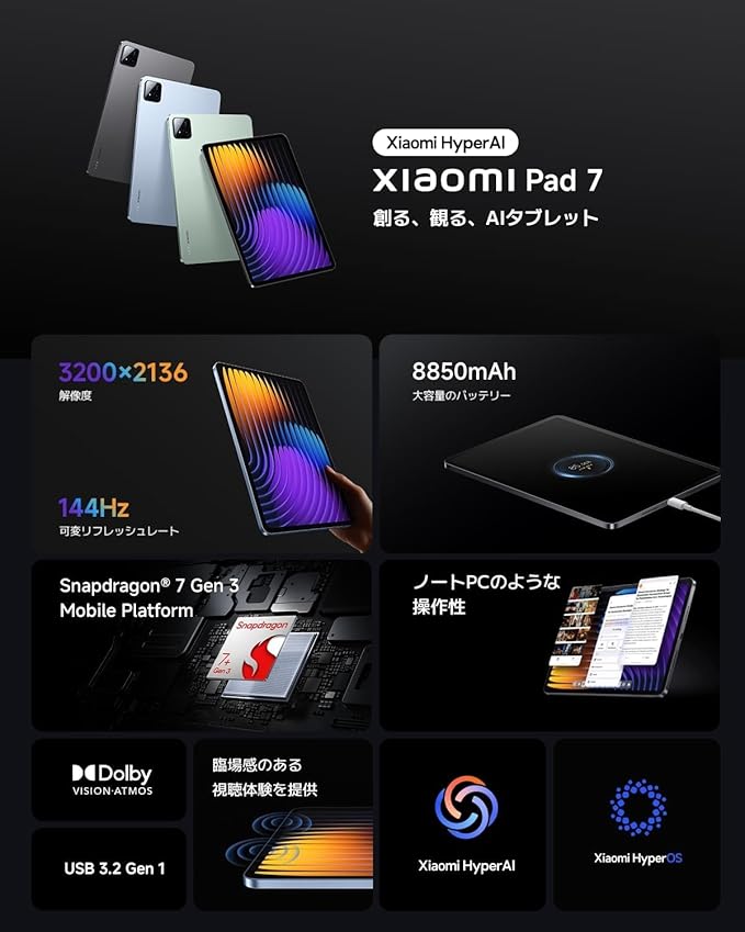 【11.2インチ 3.2Kの高精細ディスプレイ】Xiaomi Pad 7は3.2K解像度(3200 2136)に進化し、文書や資料などの操作しやすい3:2の画面比率、800nitsの最大輝度やDolby Vision、Adaptive HDR対応などの基本性能に、DCI-P3の色域にも対応します。トップクラスの鮮明さと、入念に調整されたオリジナル・カラー・プロによって、複数のデバイスでもプロフェッショナルなカラーパフォーマンスを実現します。最大144Hzの可変リフレッシュレートにより、ウェブ閲覧も、絵を描くときも、エンターテインメントを楽しむときも、なめらかかつ残像の少ないディスプレイ表示で目に優しい体験を得られます。さらに、4,096レベルの輝度調整とDC調光機能で、プロ仕様のアイ・プロテクション性能では夜間での使用にも目のケアにサポートします。