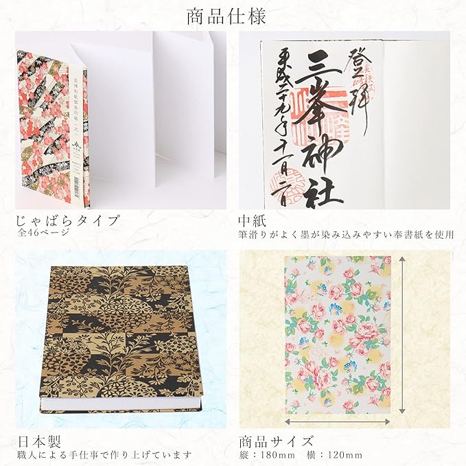 一般的に寺社などで販売されている大きさで持ち運びしやすいサイズ。蛇腹タイプ。全46ページ