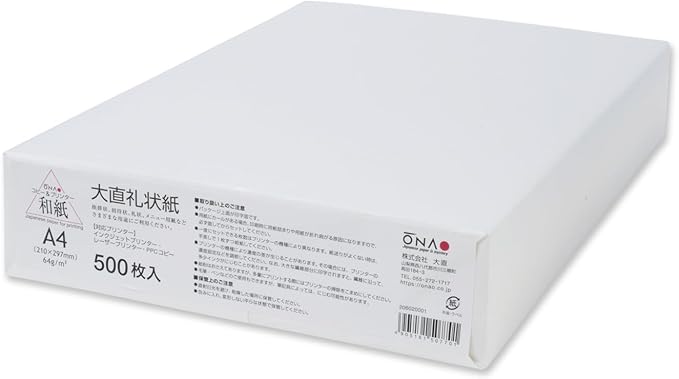 ●挨拶状、礼状、招待状などビジネスレターとして。●メニュー用紙、ランチョンマット、掛け紙、席次表など、さまざまな用途にお使いいただけるプリンター用和紙です。●ツヤのある繊維が入っています。●さまざまなプリンターで印刷ができ、ペン・毛筆にも対応。●インク乗りも良く、写真やイラストも印刷しやすいことが特徴です。●お得な500枚セットです。●※パッケージ上面が印字面です。●※用紙にカールがある場合、印刷時に用紙詰まりや用紙が折れ曲がる原因になりますので、必ず直してからセットしてください。●※一度にセットできる枚数は用紙やプリンターの機種により異なります。紙送りがよくない時は、手差しで1枚ずつ給紙してください。●※紙粉はおさえてありますが、多量にプリントする際には、プリンターの掃除をこまめにしてください。●※用紙やプリンターの機種により濃度の差が生じることがあります。その場合にはプリンターの濃度設定などを調節してください。なお、大きな繊維部分に印字されますと、繊維に沿って多少インクがにじむことがあります。●※直射日光を避け、乾燥した場所に保管してください。●※包みに入れ、変形しない平らな状態で保管してください。
