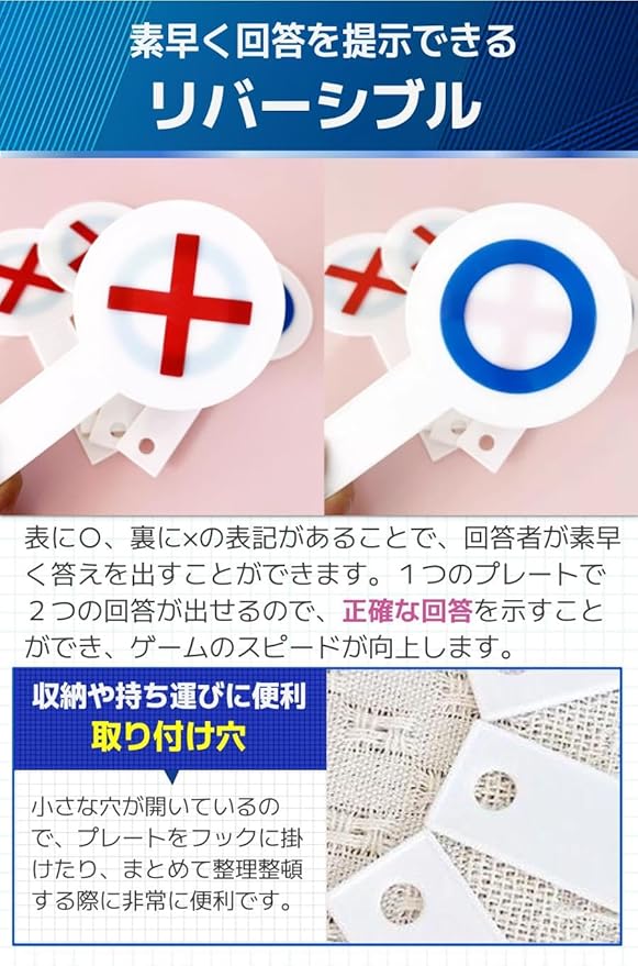 【リバーシブル】表に〇、裏に の表記があることで、回答者が素早く答えを出すことができます。1つのプレートで2つの回答が出せるので、正確な回答を示すことができ、ゲームのスピードが向上します。
