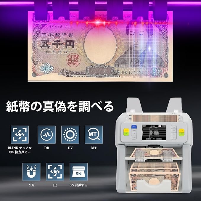 【革新的な偽札検知機能】ダブルCISセンサー、UV、MG、IR、MT、可変インクのセキュリティストリップを搭載。日本円、米ドル、ユーロ、ポンド、カナダドル、メキシコペソのシリアルナンバー認識をサポートしています。