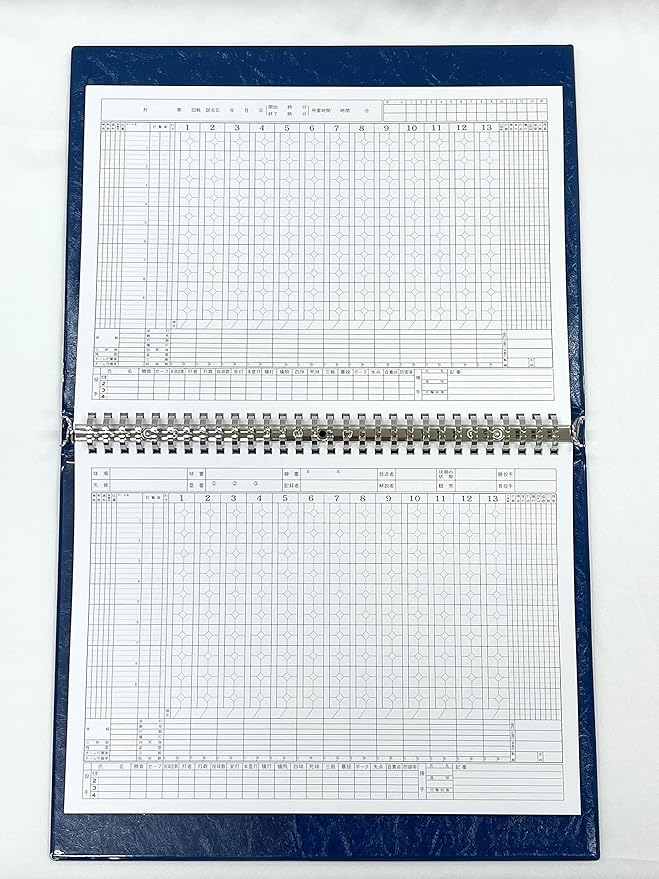 SO社・野球スコアブックのハイエンドモデル。 縦に開いて、上のページに先攻、下のページに後攻チームのプレーを記入していきます。 記入欄の線にはメリハリがあり書込みやすいよう細かな気配りがされています。 繰り返しの書込みに耐える丈夫な紙を使用。 全てのページに記録し終えましたら、別売りの「バインダー版補充用紙」をお買い求め頂くことが出来ます。 バインダーについて 革製品の様な型押しがされたボディーには高級感があり、ネイビー ホワイトの色味はシンプルで落ち着いた雰囲気です。 水に強い素材で野外での使用も安心です。 バインダー内側にはメモなどを入れておけるクリアポケット付き。 バインダー本体をすっぽりと覆うケース付きです。 バインダーのサイズ・縦 横 24 31.7(cm)
