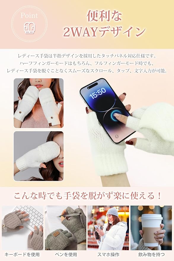 便利すぎる2WAYデザインでシーンを選ばないで防寒手袋 レディース手袋を使い勝手! 一枚で二役の優れレディース手袋! 簡単に切り替えられるフルフィンガータイプとハーフフィンガータイプを搭載。寒い屋外では指全体をしっかりガードし、室内やスマホ操作、細かい作業が必要な時は指先を素早く解放。面倒な脱ぎ履き不要で、その場でサッと切り替え可能。一本レディース手袋を持っていれば、一日中様々なシーンで活躍する、本当に便利な防寒グローブです。