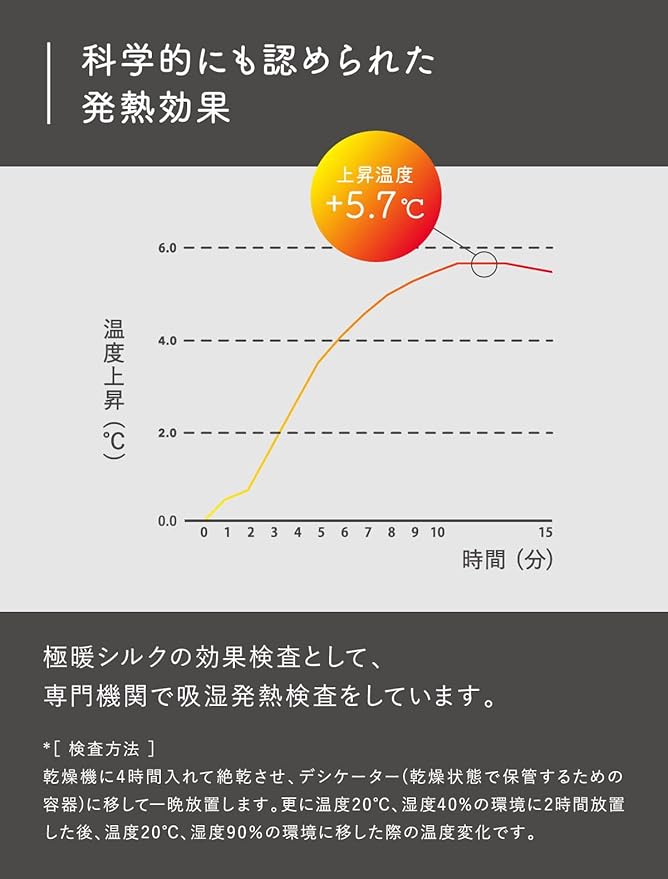 【糸から開発した、発熱する「極暖シルク」】日本の工場と協力して開発した極暖シルクは、身体から出る湿気や汗を吸収して熱に変えることで発熱します。シルク糸に直接特殊な加工を施しているため、洗濯しても発熱効果が落ちずに、心地良い暖かさが続きます。