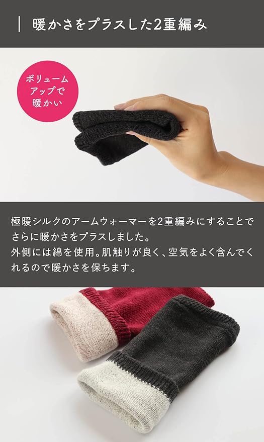 【暖かさをプラスした2重編み】極暖シルクのアームウォーマーを綿と2重編みにすることで、更に暖かさをプラスしました。外側には綿を使用し、肌触りが良く、空気をよく含んでくれるので温かさを保ちます。