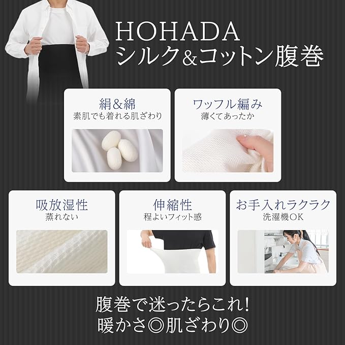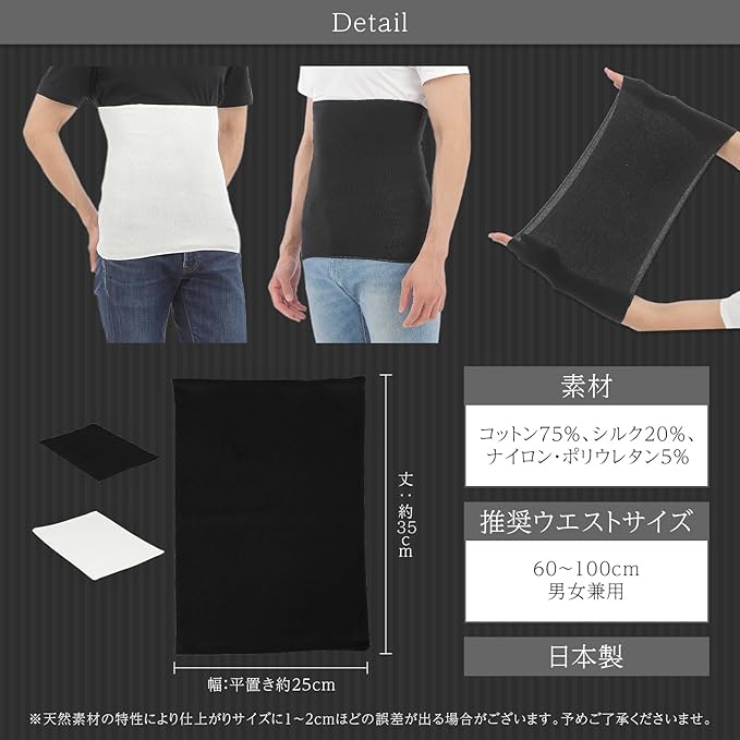 こちらは、上質なシルクとコットンを使用した腹巻です。絹の滑らかさと綿の柔らかさを兼ね備え、肌に優しく、しっかりとお腹周りを温めます。シルクは吸湿性・放湿性に優れており、1年を通して快適な着心地を保ちます。また、コットンは通気性が良く、自然な温かさを提供するため、冷えが気になる方に最適です。薄手でありながら、しっかりとした保温力を発揮し、洋服の下でもかさばりません。温活や妊活、冷え取りに効果的なアイテムとして、毎日のケアにぜひ取り入れてみてください。