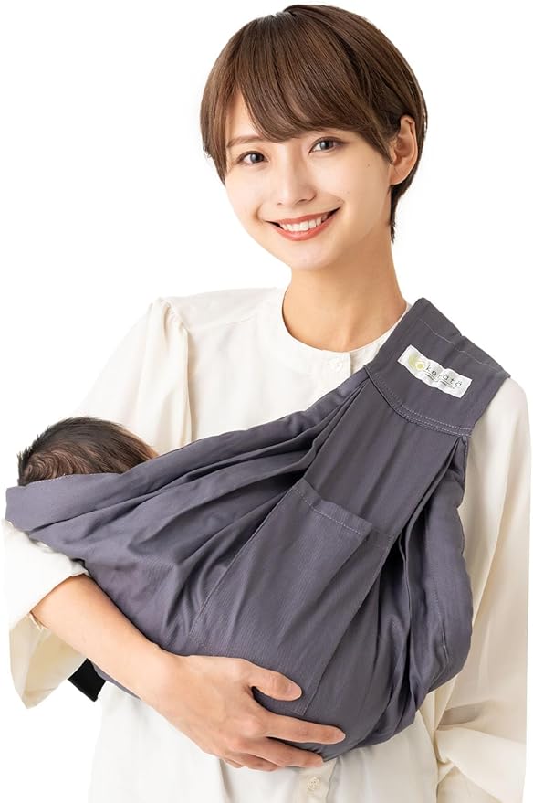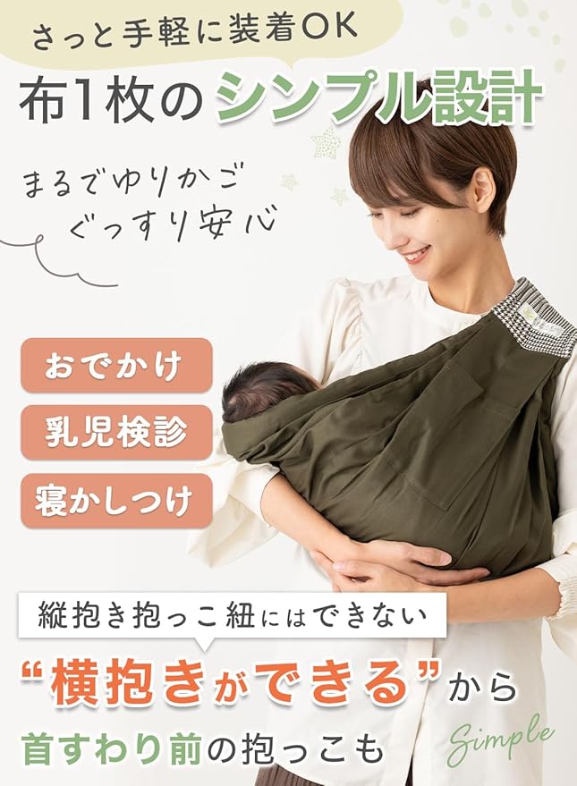 <Point.1 シンプル設計> 片肩だけで支えられる布一枚のシンプル設計。腰ベルトもないのでさっと着脱ができます。ちいさな赤ちゃんに対して大げさにならずに手軽に使えるから、おでかけや乳児検診、寝かしつけに最適です。