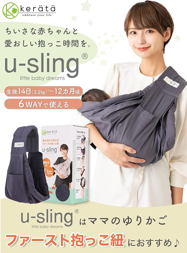 ケラッタのu-slingⓇはママのゆりかご。ファースト抱っこ紐にぴったりです。さっとつけられて密着できるからまるでママのおなかの中にいるみたい。片肩だけで支えられる布一枚のシンプル設計。腰ベルトもないのでさっと着脱ができます。ちいさな赤ちゃんに対して大げさにならずに手軽に使えるから、おでかけや乳児検診、寝かしつけに最適です。