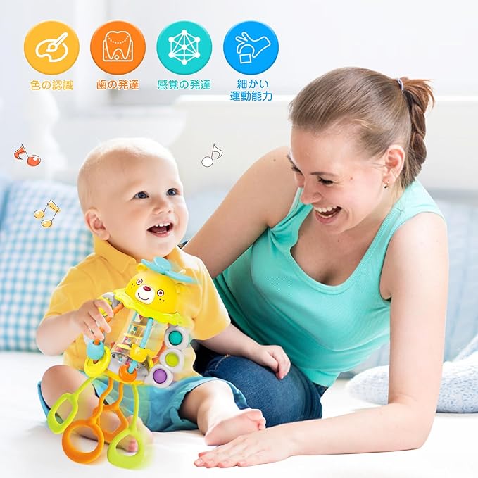 【知育玩具】滑らせる、回転させる、押すなどの動きは、赤ちゃんの腕の力を鍛え、細かい運動能力を発達させるのに役立ちます。かわいいクマやミツバチなどの形とカラフルなデザインがお子様の注意を引き、視覚の発達を刺激します。さまざまな興味深い音がお子様の聴覚の発達を刺激します。さらに、当社のおもちゃには、お子様の触覚の発達を大いに促進する、レリーフやテクスチャーのデザインが数多く組み込まれています。