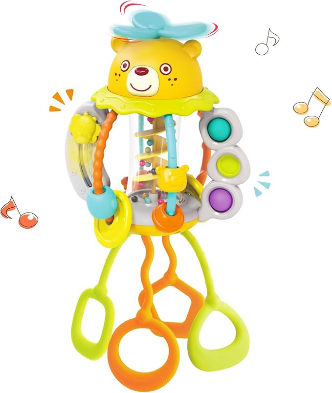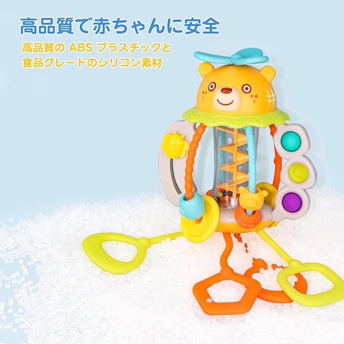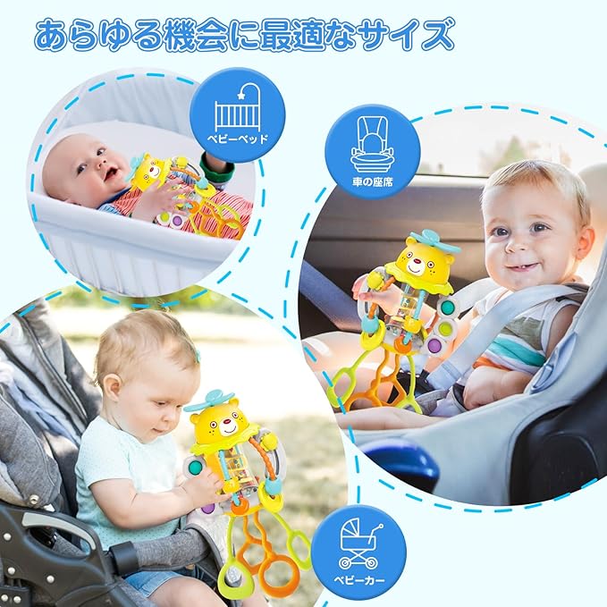 【多機能な赤ちゃんおもちゃ】さまざまな興味深いアクティビティが赤ちゃんに豊かな感覚体験を提供します。回転:赤ちゃんは上にある風車のおもちゃを簡単に回転させることができます。押す:3つのシリコンバブルおもちゃは簡単に押すことができます。スライド:ハチの形をしたボタンをスライドさせると音が鳴り、赤ちゃんを引き寄せます。引く:4本のシリコンコードで小さな手でも引っ張れます。振る:おもちゃを振るとガラガラ音が鳴ります。お子様が遊べるように、さまざまな形のビーズもあります。