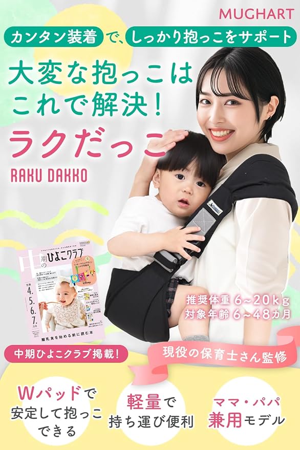 【 素材 】コットン100%、ベルト部分:ポリプロピレン、(原産国) 中国、【 商品内容 】ラクだっこ本体、取扱説明書、収納袋