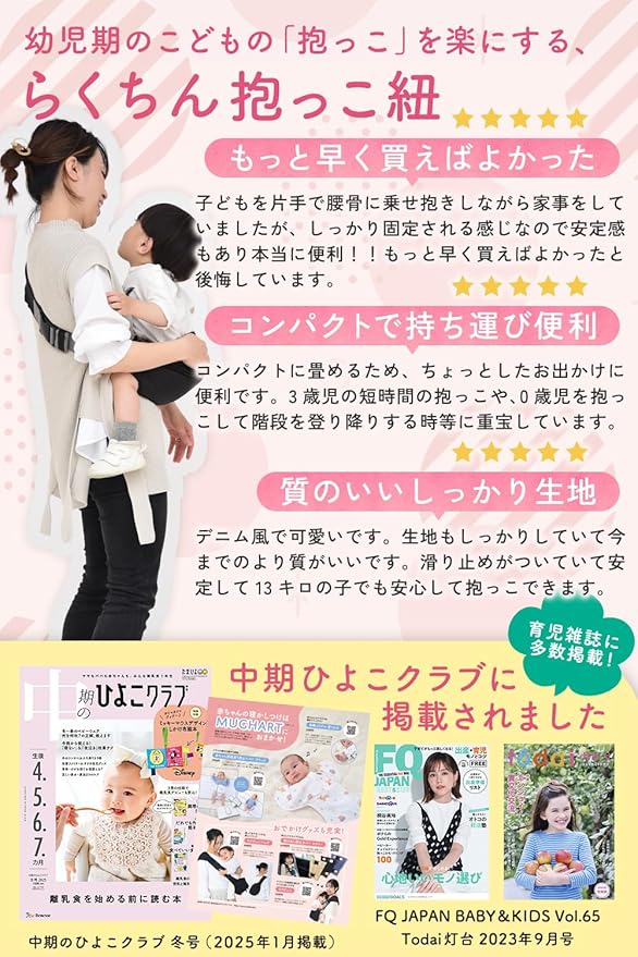 【 3ステップでカンタン抱っこ 】幼児期の急な抱っこを アシスト する、 ベビースリング ( 抱っこ紐 )です。お子様が抱っこしてほしい時に" パッと取り出し、サッと装着 "♪片手で支えながら抱っこできる 抱っこひも です。※使用中は必ず片手で支えてください。両手を放してしまうと 落下および転倒の可能性がございます ので十分注意してください。