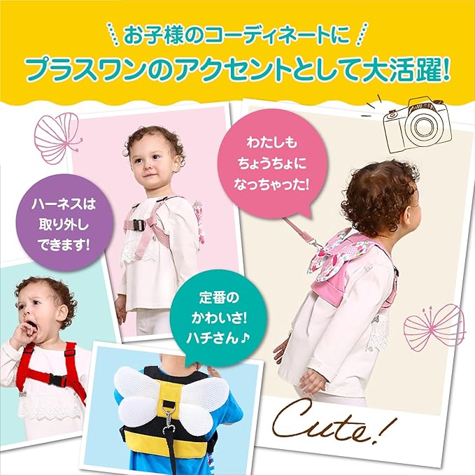 【6種類のデザイン】 ベビーも大満足!なりきりハーネスは立体的な羽や、モチーフで、ほほえましくなるような後ろ姿もポイント。かわいい動物に変身したお子様の行動範囲を管理できます。パシャリと写真を撮ればインスタ映えも◎可愛らしい背中に、みんなの視線も集まります。はちさんやピンクのちょうちょ、パープルのちょうと、デビル、ユニコーン、エンジェルなど、6種類のデザインからお選びいただけます。イベントや、ハロウィンなどのコスプレ、コスチュームとしても楽しめる、本格的なデザイン。今年のハロウィーンの仮装は、なりきりハーネスで!