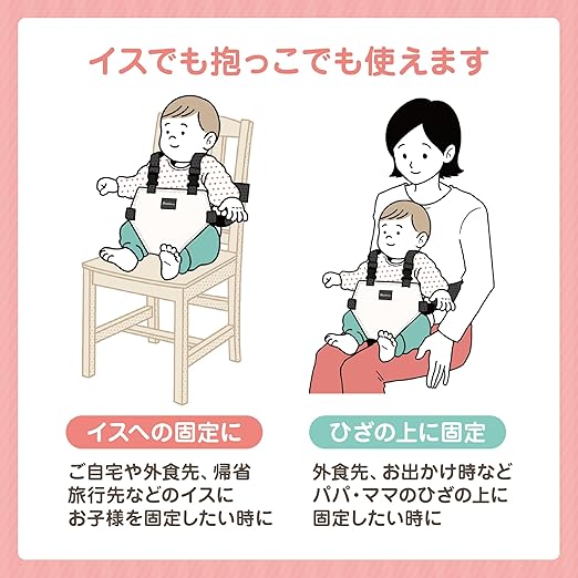 【抱っこにも対応】パパ、ママの膝の上での固定も可能。外食先でお子さま用のイスがない場合は、パパ、ママの膝の上で固定して使うこともできます。(ベルト最長113cm)