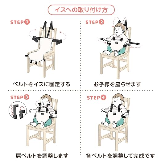 【商品仕様】○対象年齢:6か月~3歳程度(腰が座ったお子さま対象) ○サイズ:胸囲40~80cm対応 ○カラー:ブラック、ネイビー、グリーン、クリームベージュ ○セット内容:チェアベルト、説明書 ○洗濯:洗濯機で洗う場合はネットに入れて「弱」での洗濯をおすすめします。