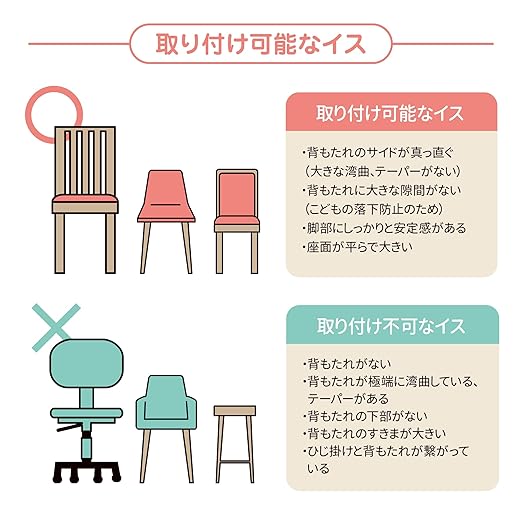 【赤ちゃんの抜け出し防止に】お子さまがお食事中におとなしく座っていてくれない…とお困りの方にご好評いただいている抜け出し防止チェアベルト。一般的なイスであれば取り付け可能ですので、ご自宅での使用はもちろんのこと、外食時などお子さま用のイスがない場所でも活躍できます。
