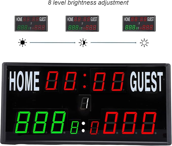 多彩な時計機能: 24 時間表示モードを備えたスコアボードは、リモコンを使用して簡単に調整でき、スコア、セット、試合表示を 8 段階の明るさレベルで提供します。